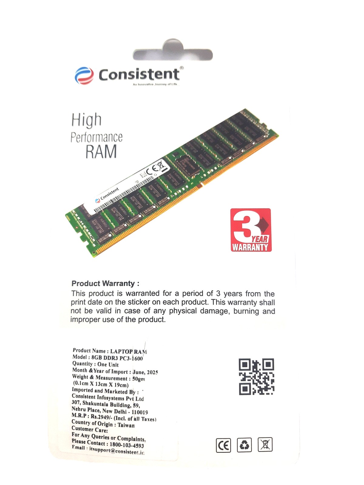 Consistent has earned a reputation for delivering durable and high-quality memory solutions. The 8GB DDR3L 1600MHz Laptop RAM undergoes rigorous testing to ensure stability, compatibility, and long-term reliability. Whether you are upgrading an older laptop to extend its life or improving the performance of a work system, this RAM provides exceptional value.